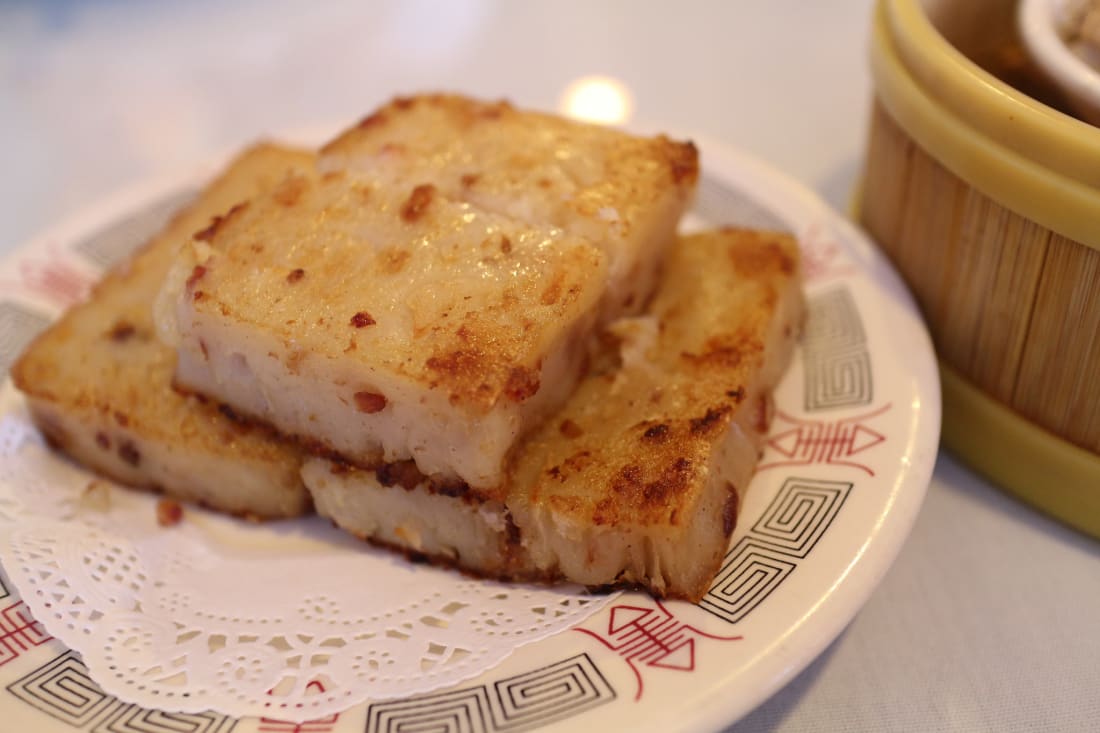 - Radish cake: Pan-fried slabs made out of shredded daikon radish, taro root, and rice flour, flavored with chili and soy sauce